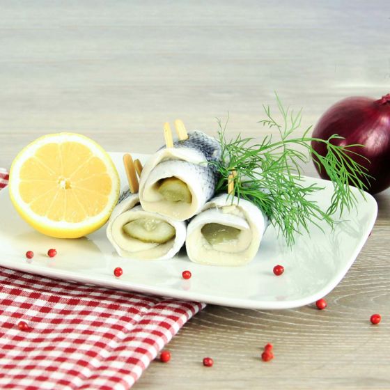 Inhaltsstoffe Rollmöpse 71% [Hering [clupea harengus], Gurken, Branntweinessig, Speisesalz], Wasser, Zucker, Zwiebeln, Lorbeerblatt, Speisesalz, Branntweinessig, E954 Saccharin, Aroma